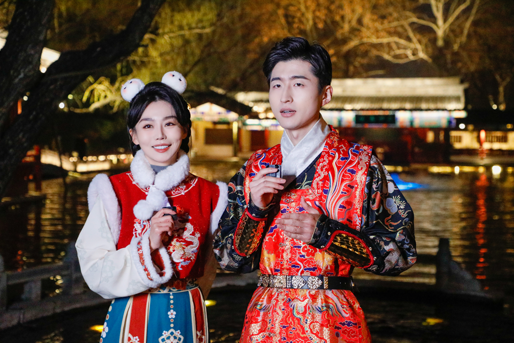 Popular online celebrity YOYO/Haoxin transformed into the famous literary figures Li Qingzhao and Xin Qiji from the Song Dynasty, leading global overseas Chinese into the Mingshui Ancient Town of Zhangqiu with the theme of "Er'an" in Jinan to appreciate the beautiful scenery and enjoy the cultural spring. Together with guests, they extended blessings and invitations to global overseas Chinese.