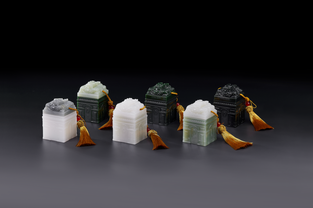 "L'emblème des Jeux olympiques de Paris 2024 comprend un double sceau en qingyu, un double sceau en jaspe qingyu, un double sceau en jade blanc verdâtre, un double sceau en jade blanc, un double sceau en jade blanc, un double sceau en jade blanc suif, et un double sceau en jade blanc suif à graines bleues et blanches.