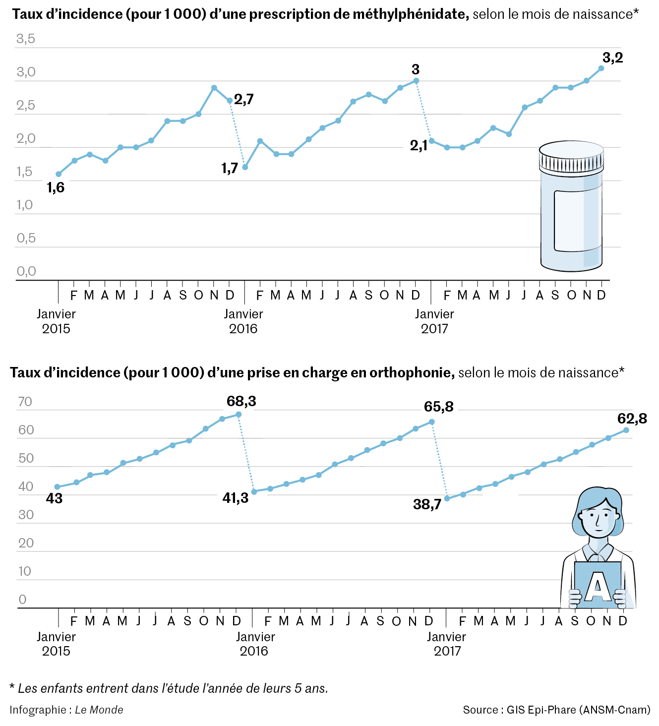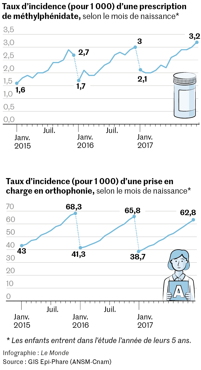 Résultats : la prescription de méthylphénidate et de séances d’orthophonie augmente régulièrement selon le mois de naissance,de janvier à décembre. D’autres études internationales avaient mis en évidence ce lien pour le seul méthylphénidate,mais cela n’avait jamais été observé pour l’orthophonie.