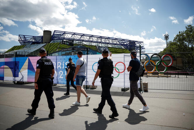 La police française patrouille dans une rue près de l’Accor Arena,avant les Jeux olympiques et paralympiques,à Paris,le 4 juillet 2024. BENOIT TESSIER / REUTERS Cinq mille fonctionnaires de police ont gagné ces derniers jours la région parisienne,dans le cadre des opérations de sécurisation des Jeux olympiques et paralympiques de Paris (JOP). Venu notamment de casernes de CRS et de commissariats de Meurthe-et-Moselle,de Charente,de Dordogne,des Landes,du Var et des Bouches-du-Rhône,ce premier contingent est appelé à monter en puissance et à fournir la plus grande part des effectifs qui assureront la sécurité de la cérémonie d’ouverture,toujours annoncée – en dépit des incertitudes liées à la situation politique du pays – pour le vendredi 26 juillet.