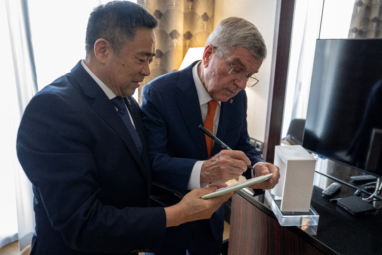 Le président Bach a également signé personnellement l'œuvre "Jeux olympiques de Paris 2024 - Jade chinois, bouteille triomphante" et a pris une photo avec elle. Le président Bach a déclaré que le trésor artistique « Jeux olympiques de Paris 2024 - Jade chinois, bouteille triomphante" incarne non seulement l'esprit olympique, mais sert également de pont pour les échanges culturels. Il le placera personnellement sur son bureau et fera don d'un autre ensemble au Musée international olympique pour que les gens du monde entier puissent l'apprécier et s'en inspirer.