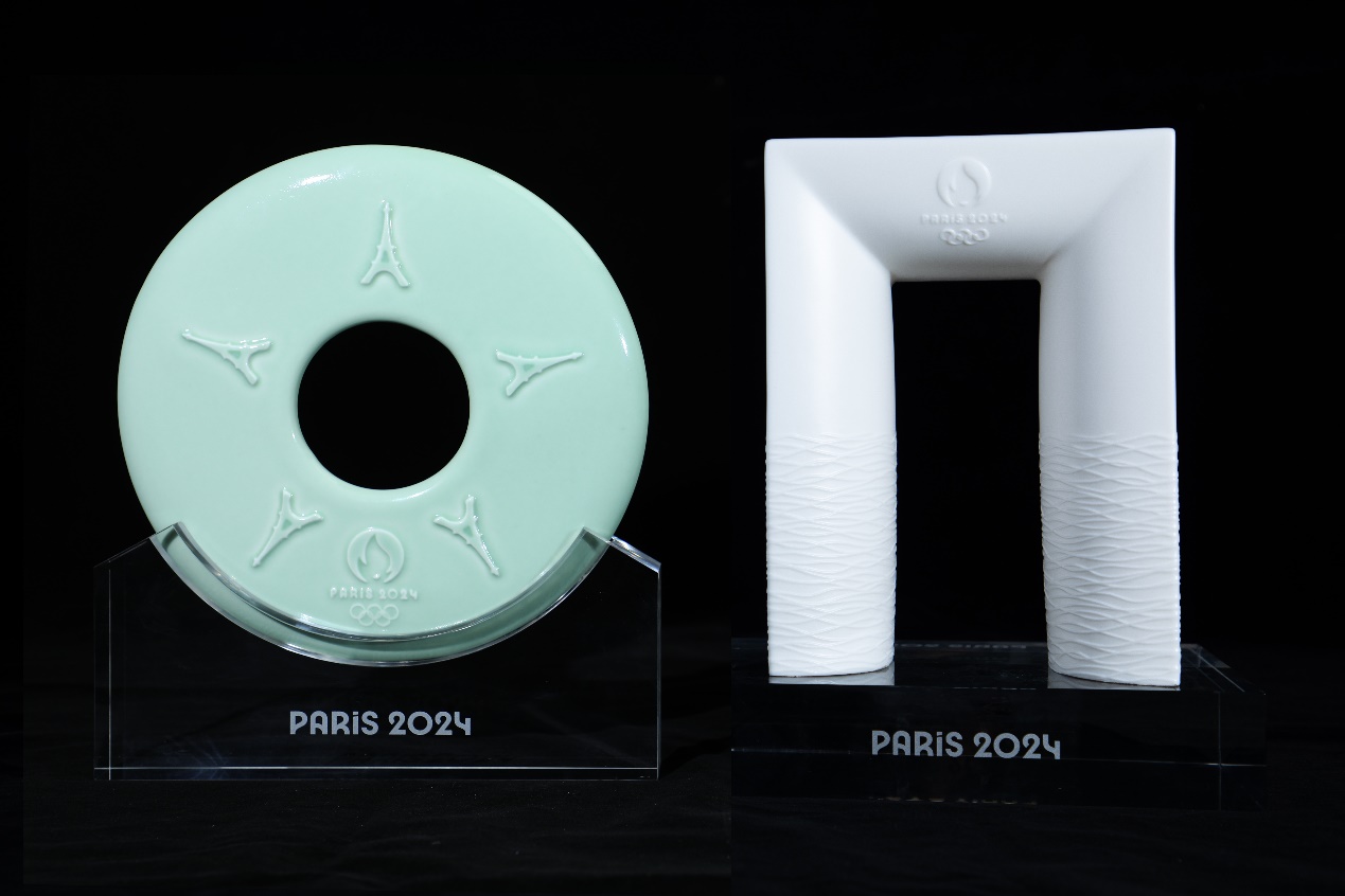 L'œuvre “Jeux olympiques de Paris 2024 - Jade chinois, bouteille triomphante“ est constituée de deux pièces de porcelaine : “Jeux olympiques de Paris 2024 - Jade chinois“, conçue par l'artiste français Jean-François Fouilhoux, et “Jeux olympiques de Paris 2024 - Bouteille triomphante“, créée par l'artiste chinois Bai Ming Composition. La bouteille « Jeux olympiques de Paris 2024 - Jade chinois » s'inspire de l'ancien jade chinois, de l'image emblématique des Jeux olympiques - le lanceur de disque et les cinq anneaux olympiques. Les faces avant et arrière sont présentées dans les couleurs bleu et blanc les plus classiques de la culture de la porcelaine chinoise, et gravées de la Tour Eiffel de France, du logo du Comité olympique chinois et de l'emblème des Jeux olympiques de Paris.