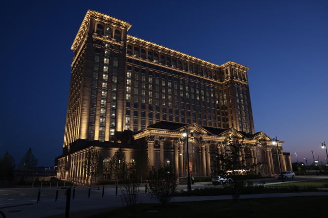 Dans la gare Michigan Central,à Detroit,le 13 mai 2024. CARLOS OSORIO / AP Corktown est déjà en cours de gentrification – le quartier de Michigan Central porte le nom de la ville irlandaise dont venaient ses premiers habitants,dont Henry Ford. Mais,au-delà de ce quartier,toute la ville est déjà métamorphosée. Du dix-septième étage de l’ancienne gare,elle apparaît dans toute sa singularité. Au milieu du quartier historique,les grues encadrent une nouvelle tour en construction : Hudson’s Detroit,la première depuis les années 1970. Ce nouveau bâtiment accueillera,en 2025,le nouveau siège de General Motors,et sera le fleuron du promoteur immobilier Bedrock,propriété de Dan Gilbert.