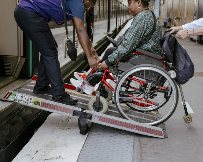Le métro parisien n’étant quasi pas accessible aux fauteuils roulants,Ndieme Lame,bénévole pour les Jeux olympiques et paralympiques,doit emprunter le RER B avec l’assistance d’un agent (ici,le 21 août 2024). MATHIAS BENGUIGUI / PASCO AND CO POUR « LE MONDE » Faire aussi bien pendant les Jeux paralympiques – ils se tiennent du mercredi 28 août au dimanche 8 septembre – que pendant les Jeux olympiques (JO) pour transporter les spectateurs et les Franciliens : c’est le défi qu’Ile-de-France Mobilités (IDFM),l’autorité organisatrice des transports de la région parisienne,s’est fixé. Il y aura certes moins de spectateurs à acheminer que pendant la quinzaine des JO – soit 300 000 par jour au lieu de 500 000 –,moins de sites à desservir (dix-sept contre vingt-cinq) en douze jours (dont deux week-ends),mais les Franciliens seront rentrés de vacances et,le 2 septembre,les transports scolaires devront être en ordre de marche.