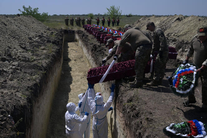 Une photo fournie par l’agence de presse russe Sputnik prise lors de l’enterrement de 20 soldats russes non identifiés à Louhansk,dans le Donbass,le 6 juillet 2024. EVGENY BIYATOV / SPUTNIK / SIPA Deux ans et demi après avoir lancé son « opération militaire spéciale » en Ukraine,le président russe,Vladimir Poutine,cherche à attirer de nouveaux volontaires pour aller combattre sur le front. Lancées dans une course à l’enrôlement,les autorités russes,fédérales comme régionales,promettent des soldes mirobolantes,des avantages sociaux alléchants,des primes importantes,à grand renfort de campagnes de propagande diffusées dans les rues,au sein des universités,sur les réseaux sociaux,ou à la télévision. « Rejoins les tiens ! »,« Sois un héros ! »,proclament les affiches placardées un peu partout sur le territoire. « Défends la terre de Koursk ! »,prône une autre,toute récente,appelant les hommes,« jusqu’à 65 ans »,à rejoindre le « détachement de volontaires Bars-Koursk » afin de libérer cette région frontalière russe des forces ukrainiennes qui l’occupent en partie depuis le 6 août.