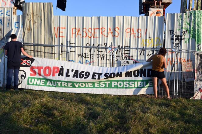 Deux manifestants accrochent une banderole pour dénoncer la construction de l’A69,à Saïx (Tarn),le 28 août 2024. REMY GABALDA/MAXPPP A l’approche du 1er septembre,premier jour de la période d’abattage des arbres sur le tracé de l’A69,autoroute de 53 kilomètres qui doit relier Toulouse et Castres,des opposants entendent continuer d’occuper le terrain. Un rassemblement,interdit par la préfecture du Tarn,s’est déroulé dans le calme mercredi 28 août sur le site de la Cal’Arbre,du nom de la zone à défendre (ZAD),située à Saïx (Tarn). « On veut ramener du monde car l’occupation est le meilleur moyen pour agir »,explique Léo (qui requiert l’anonymat),une étudiante toulousaine en histoire,dont les paroles sont recouvertes par le bruit d’un hélicoptère de la gendarmerie qui survole le site. « Car on constate que notre présence est utile : elle permet de retarder le chantier »,se félicite l’étudiante qui tient le siège depuis juin.