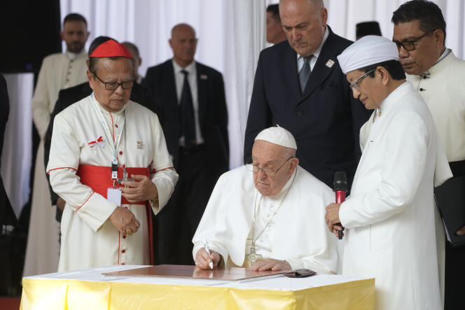 Le pape François,accompagné de l’archevêque de Djakarta,le cardinal Ignatius Suharyo Hardjoatmodjo,à gauche,et du grand imam Nasaruddin Umar,à droite,signe une plaque commémorative de sa visite au « Tunnel de l’amitié » reliant la mosquée Istiqlal à la cathédrale Notre-Dame-de-l’Assomption à Djakarta,le jeudi 5 septembre 2024. GREGORIO BORGIA / AP Pourquoi le pape,âgé de 87 ans et à la santé fragile,tenait-il tant à ce voyage de douze jours à travers quatre pays d’Asie du Sud-Est ? Selon Michel Chambon,anthropologue et théologien catholique,les enjeux sont aussi religieux que politiques. Pour ce spécialiste du catholicisme en Asie,qu’il étudie depuis l’Université nationale de Singapour,cité-Etat où le souverain pontife doit se rendre du 11 au 13 septembre,François cherche à envoyer un message à la fois à son Eglise et aux grandes puissances mondiales,à commencer par la Chine.