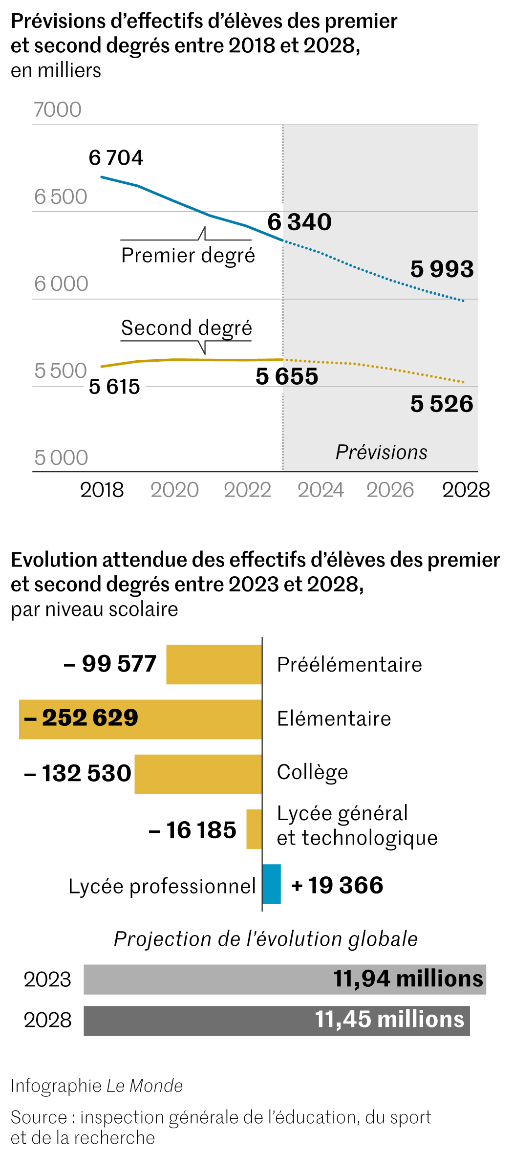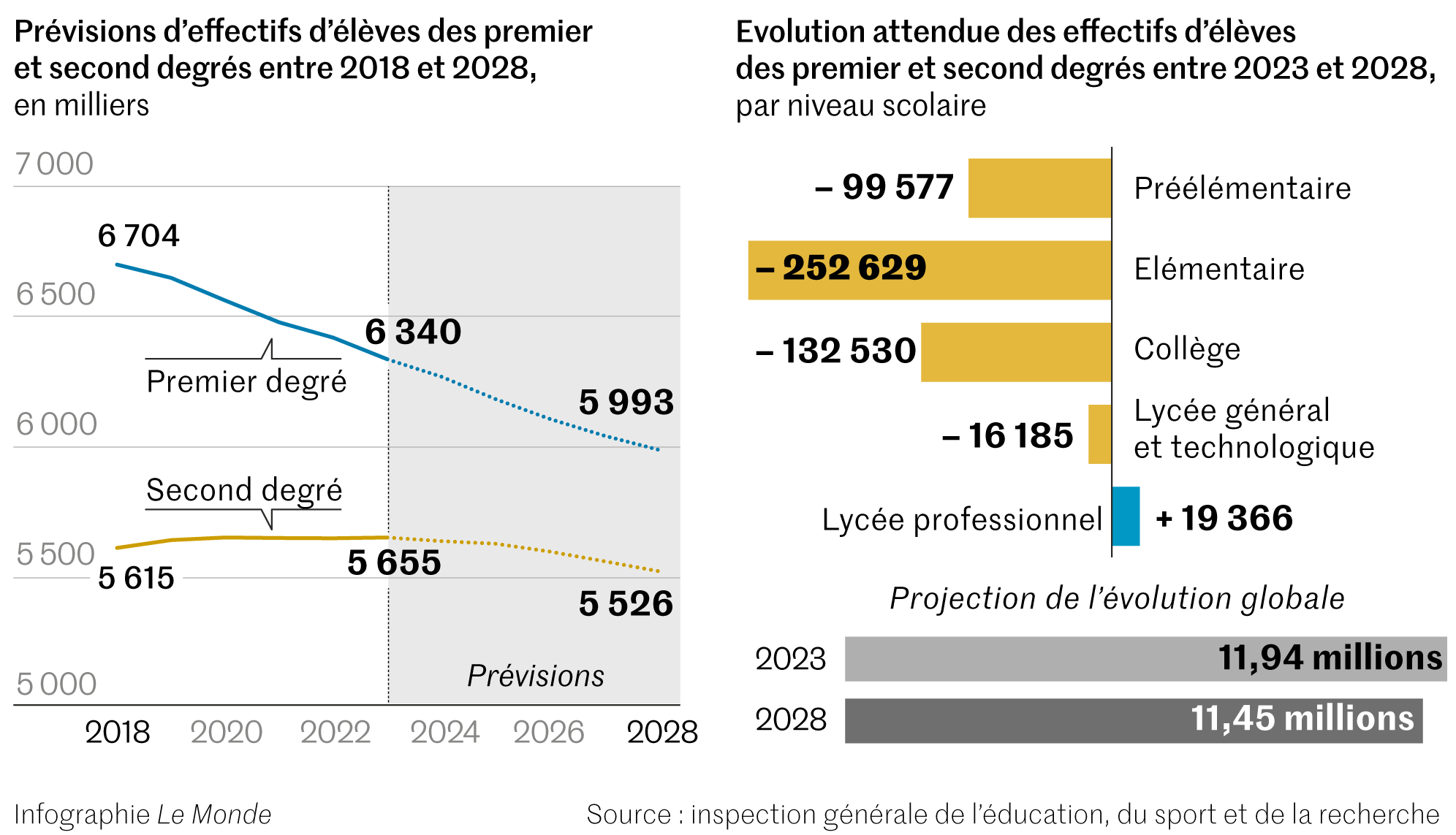 Daté d’avril mais rendu public en septembre,ce rapport,commandé par Matignon à l’automne 2023,explore différents scénarios pour tirer parti de la diminution du nombre d’élèves dans les années à venir et ainsi supprimer des postes d’enseignants et faire des économies budgétaires. Cette baisse démographique peut « justifier une réduction des moyens d’enseignement »,jugent les auteurs.