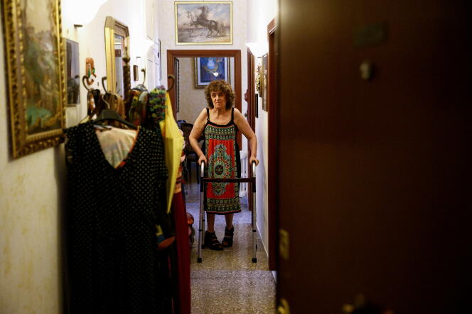 Donatelli Fedeli,58 ans,regarde partir le médecin venu lui rendre visite à domicile pour lui apporter de l’aide,alors que l’Italie fait face à une vague de chaleur,à Rome,le 18 juillet 2023. GUGLIELMO MANGIAPANE / REUTERS Arrivée en Italie en 2010,Oleksandra Dzhevegeska,50 ans,de nationalité ukrainienne,appartient aux badanti,ces auxiliaires de vie qui accompagnent les aînés d’un pays vieillissant. Le nombre de ces auxiliaires,des femmes dans leur écrasante majorité,était estimé à 1,07 million en 2022. Rouages essentiels de la société transalpine,immigrées dans près de 70 % des cas,elles sont,pour une large part,originaires d’Europe orientale,d’Amérique latine ou des Philippines et destinées à accueillir dans leurs rangs un nombre croissant de recrues.