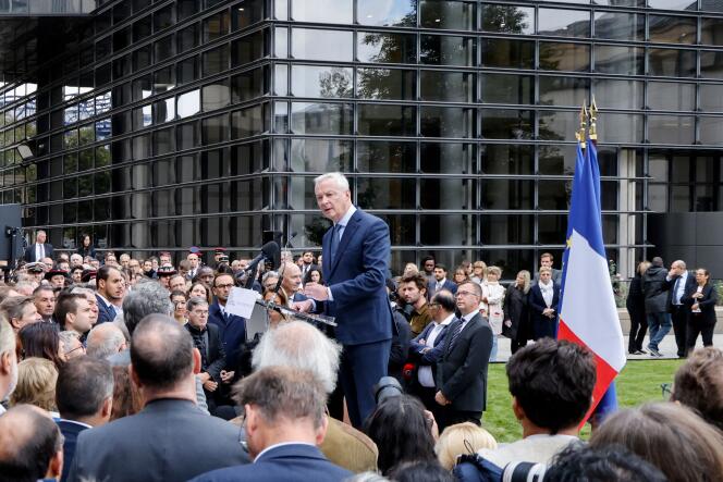 Bruno Le Maire lors de son discours d’adieu devant le ministère français de l’économie et des finances,à Paris,le 12 septembre 2024. LUDOVIC MARIN / AFP Il est 11 h 10,ce jeudi 12 septembre,quand Bruno Le Maire prend le micro devant des centaines d’invités réunis dans la grande cour de Bercy. « Mes chers amis,je pars,commence-t-il. Comme dirait Michel Sardou,je vous aime,mais je pars. » Une chanson sur le suicide d’un enfant,curieuse référence musicale pour un discours de départ. Sans doute le ministre ne connaissait-il pas le sens des paroles de Je vole pour l’auteur. Car la suite des propos de Bruno Le Maire est limpide : s’il s’apprête à lâcher pour le moment la politique et à rendre les clés de Bercy,qu’il détenait depuis mai 2017,ce départ n’a rien de définitif. « J’espère bien que nous allons garder le lien que nous avons tissé pendant sept ans,et donc je vous dis à bientôt »,conclut-il dans son message aux Français,publié simultanément sur X.