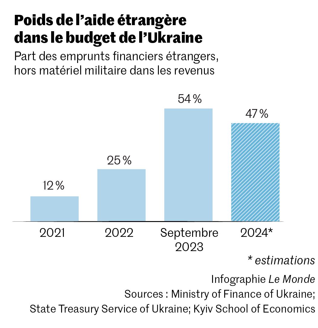 Avec l’intensification des frappes russes sur les infrastructures énergétiques,la croissance du PIB ukrainien ne devrait pas dépasser les 3,5 %,contre 5,3 % en 2023. Le déficit budgétaire devrait continuer de se creuser à 43 milliards de dollars (38,8 millions d’euros). Celui-ci est passé de 3,6 % du PIB en 2021 à 27 % en 2023. Le pays dépend désormais de l’aide étrangère pour près de la moitié de son budget.