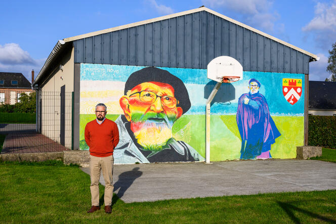 Le maire d’Esteville (Seine-Maritime),Manuel Grente,devant la fresque peinte par l’artiste Ernesto Novo,hommage à l’abbé Pierre,en septembre 2024. JACOB KHRIST / HANS LUCAS POUR « M LE MAGAZINE DU MONDE » « Il a essayé d’aimer. » Avec l’avalanche de témoignages sur les agressions sexuelles de l’abbé Pierre qui a suivi les premières révélations du mouvement Emmaüs,le 17 juillet,l’épitaphe devenait insoutenable. La plaque,apposée sur la tombe du religieux,à Esteville (Seine-Maritime),a été retirée. Le prêtre,fondateur d’Emmaüs,en 1949,pour lutter contre l’exclusion,a longtemps été la fierté de ce village de cinq cent soixante habitants,situé à 30 kilomètres au nord-est de Rouen.