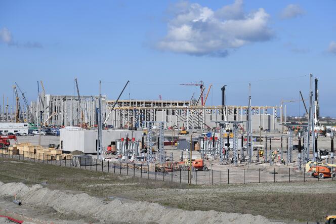 Le chantier de l’usine Verkor,à Bourbourg (Nord),le 6 mars 2024. MARC DEMEURE / VOIX DU NORD / MAXPPP Pour voir la gigafactory Verkor,il faut rouler jusqu’au fond du grand port maritime de Dunkerque (Nord),dépasser l’aciérie ArcelorMittal,longer l’usine de production d’aluminium puis le quai de déchargement des porte-conteneurs (qui pourrait bientôt doubler en longueur) et tourner le dos aux terrains qui doivent accueillir deux réacteurs pressurisés européens à Gravelines. Un immense parallélépipède de béton gris se dresse alors sous nos yeux. Il est installé derrière l’usine du groupe belge Clarebout,qui transforme les pommes de terre en frites ou en flocons déshydratés.