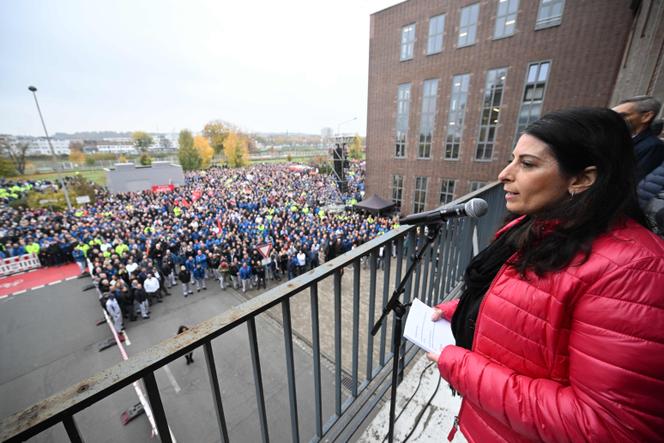 La présidente du comité d’entreprise de Volkswagen,Daniela Cavallo,s’adresse aux employés du constructeur automobile,au siège de l’entreprise,à Wolfsburg,dans le nord de l’Allemagne,lundi 28 octobre 2024. JULIAN STRATENSCHULTE / AFP Les annonces ne sont pas encore précises,mais l’ampleur de la chirurgie que va subir le groupe Volkswagen a été présentée par la syndicaliste et présidente du comité d’entreprise,à plusieurs milliers de salariés réunis devant l’usine principale,à Wolfsburg (Basse-Saxe). « Le directoire souhaite fermer au moins trois usines en Allemagne »,a-t-elle déclaré lors d’une réunion d’information,lundi 28 octobre. Vêtue d’une doudoune rouge,l’élue,qui siège au conseil de surveillance,les a appelés à résister à cette « saignée » sans précédent.