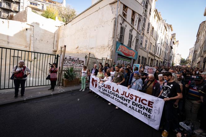Manifestation pour réclamer le droit à un logement décent et rendre hommage aux victimes de l’effondrement des deux immeubles de la rue d’Aubagne,à Marseille,le 3 novembre 2024. MIGUEL MEDINA/AFP « C’est pas les pauvres qu’il faut virer. C’est pas les tours qu’il faut raser. C’est le mal-logement qu’il faut traiter. » Le slogan a résonné plusieurs fois,dimanche 3 novembre,dans la rue d’Aubagne (1er arrondissement),à Marseille. Quatre jours avant l’ouverture du procès devant déterminer les responsabilités ayant conduit à l’effondrement de deux immeubles qui,le 5 novembre 2018,ont fait huit morts,plusieurs centaines de manifestants sont venus demander « justice et vérité » pour les victimes. Mais aussi rappeler à quel point la question de l’habitat indigne reste centrale dans la deuxième ville de France,six ans après le drame.