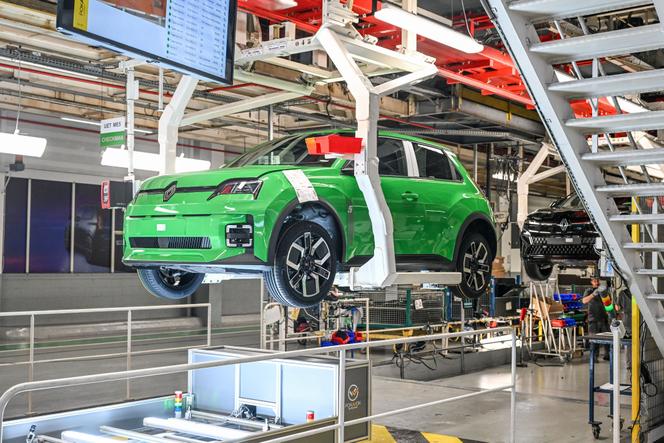 L'atelier de production avec la ligne d'assemblage de la R5 E-Tech Electrique,à Douai,dans le Nord,le 6 novembre 2024. JEAN-LUC FLEMAL/BELPRESS/ANDIA.FR C’est ici à Douai,que la première R5 a été construite,en 1974. Ici que désormais,la nouvelle R5,remodelée et 100 % électrique,sort de la chaîne. Il s’en fabrique 300 par jour. Entre les versions jaune,bleu nocturne,noire,voire Alpine,de ce nouveau modèle,on aperçoit aussi sur la ligne de montage des Mégane E-Tech et des Scénic.