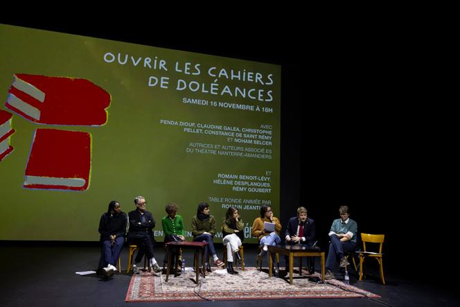 La soirée de lectures « Ouvrir les cahiers de doléances »,au théâtre des Amandiers,à Nanterre,le 16 novembre 2024. GERALDINE ARESTEANU Michel Barnier aurait pu venir au théâtre des Amandiers à Nanterre,samedi 16 novembre. Le premier ministre,qui a annoncé dans Le Parisien le 26 octobre avoir demandé à ses équipes de se plonger dans les cahiers de doléances issus de la crise des « gilets jaunes » pour élaborer son futur « plan d’action »,aurait constaté que le monde théâtral a pris les devants et s’est emparé de ces pages noircies par des citoyens,mais oubliées sur les étagères des archives départementales et nationales depuis plus de cinq ans par le pouvoir politique.