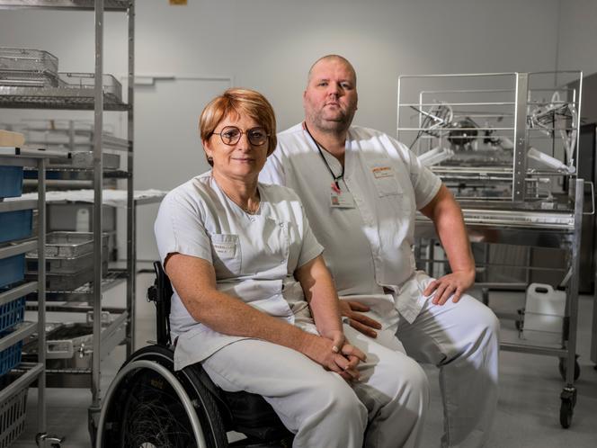 Stéphanie Vidal,infirmière dans le service de stérilisation de l’hôpital Nord Franche-Comté,et Julien Antoine,cadre du service,à Trévenans (Territoire de Belfort),le 14 novembre. PASCAL BASTIEN POUR « LE MONDE » La vie de Stéphanie Vidal bascule lorsqu’elle est victime d’un accident de moto,en avril 2005. Alors âgée de 31 ans,l’infirmière de bloc opératoire au centre hospitalierBelfort-Montbéliard (devenu hôpital Nord Franche-Comté en 2017) apprend qu’elle ne remarchera plus et ne pourra plus exercer. « Passionnée par mon métier,j’ai d’emblée refusé la mise à l’écart professionnelle pour invalidité »,se souvient la quinquagénaire. Après plus de deux ans d’arrêt longue maladie,elle s’équipe d’une voiture adaptée,garante de son autonomie,et se sent prête à reprendre le travail.