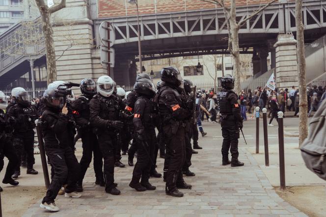 Une unité de la BRAV-M déployée lors de la onzième journée de mobilisation contre la réforme des retraites,à Paris,le 6 avril 2023. AGNÈS DHERBEYS / MYOP POUR « LE MONDE » Une fille de 15 ans giflée,un manifestant éborgné par une grenade,une moto de la police qui roule sur un homme au sol… Près de deux ans après le début du mouvement de protestation contre la réforme des retraites,en janvier 2023,les responsabilités de fonctionnaires de police mis en cause dans des cas allégués de violence n’ont toujours pas été établies.