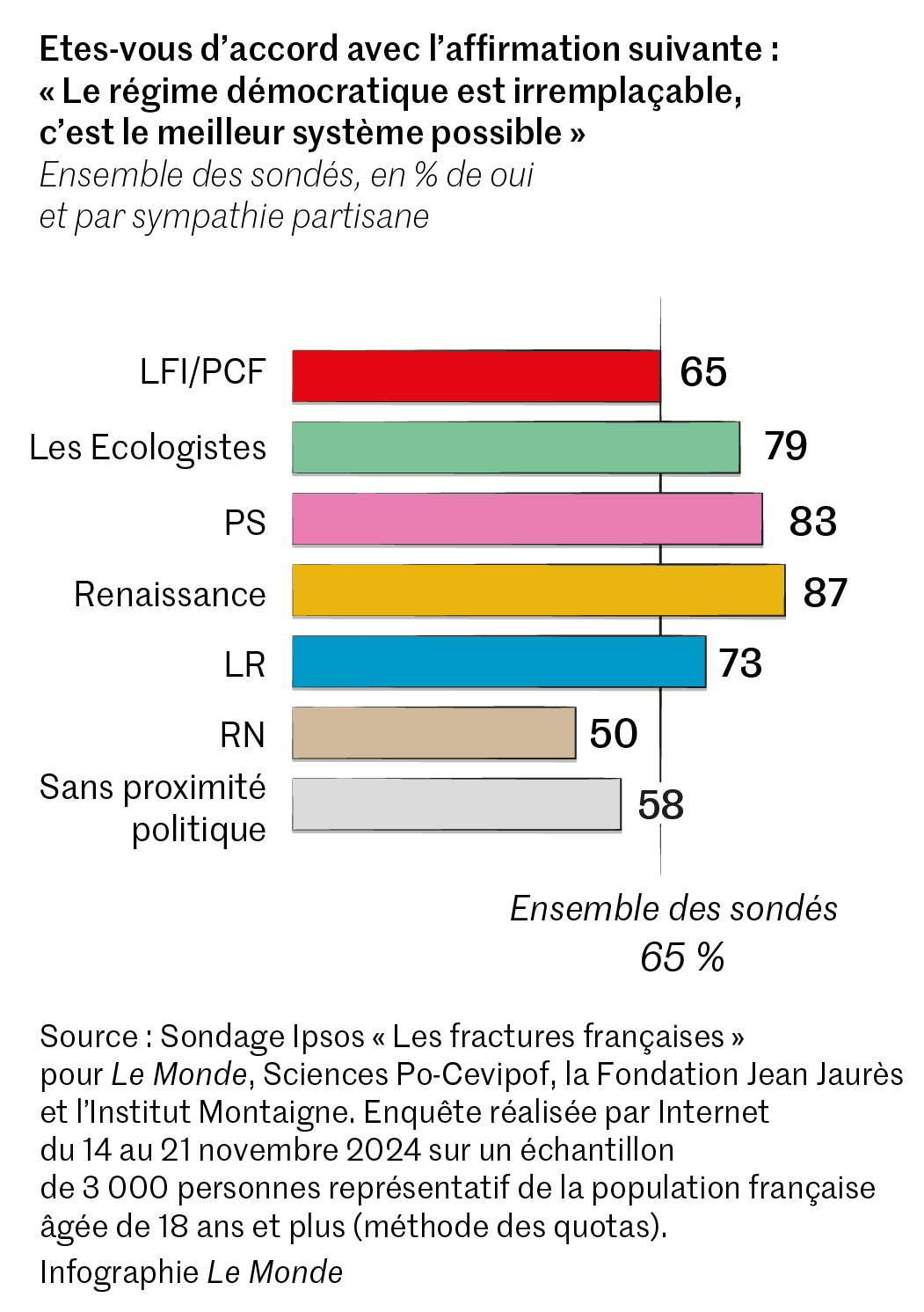 La crise politique invoquée par Emmanuel Macron pour justifier sa dissolution n’a pas été enrayée. Pire,elle semble plus aiguë encore qu’il y a un an. C’est l’un des enseignements de la douzième vague de l’étude « Fractures françaises »,réalisée par Ipsos pour Le Monde,la Fondation Jean Jaurès,le Centre de recherches politiques de Sciences Po (Cevipof) et l’Institut Montaigne,du 14 au 21 novembre auprès d’un panel de 3 000 personnes. « Le chaudron bouillonne »,résume Brice Teinturier,le directeur général délégué d’Ipsos,qui souligne une corrélation particulière,cette année,entre la « sphère personnelle et la sphère politique ».