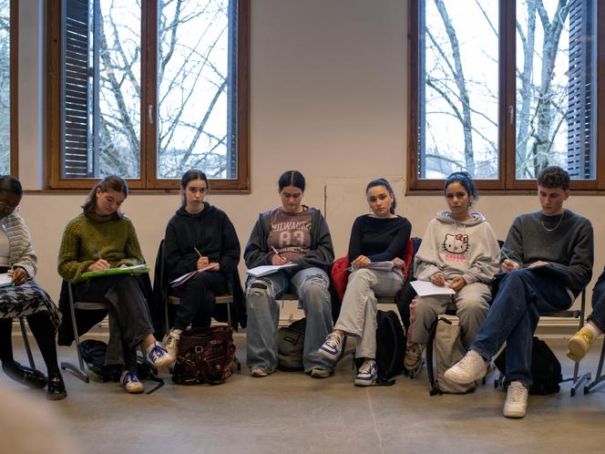 Des élèves de terminale du lycée Corot,à Savigny-sur-Orge,participent à une rencontre avec des victimes d’attentats,à Savigny-sur-Orge (Essonne),le 10 décembre 2024. MARION POUSSIER POUR « LE MONDE » Sur son carnet,Noah crayonne la salle d’audience des grands procès du Palais de justice de Paris. En ce lundi 16 décembre,la longue pièce,construite pour le procès des attentats de novembre 2015,est le théâtre du réquisitoire du procès de l’assassinat du professeur d’histoire-géographie Samuel Paty,en 2020. De son banc au fond de la salle,le jeune lycéen dresse une perspective entre le box des accusés et le pupitre des avocats généraux. Au milieu,au-dessus du président de la cour d’assises spéciale de Paris,trône la balance de la justice que l’élève de terminale s’attache à croquer. Le symbole se retrouve dans beaucoup de carnets de ses camarades de classe,venus comme lui assister à cette matinée d’audience. « S’attaquer à un professeur,c’est s’attaquer à nos libertés »,juge Noah,le crayon à la main.