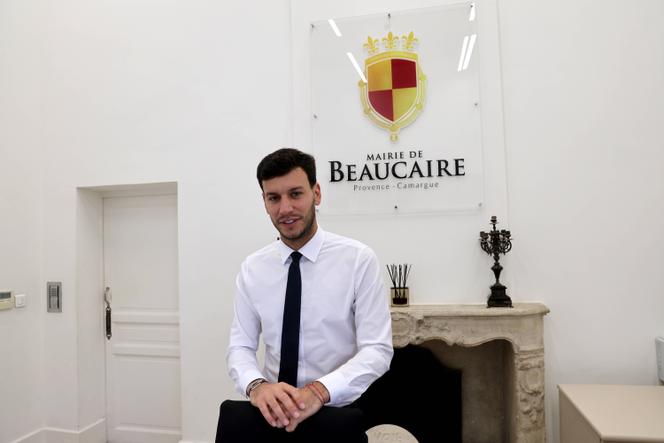 Nelson Chaudon,maire Rassemblement national,dans sa mairie de Beaucaire (Gard),le 5 août 2024. ALAIN ROBERT / SIPA A Beaucaire,ville du Gard dirigée par le Rassemblement national depuis dix ans,la municipalité d’extrême droite installe chaque année une crèche provençale au mois de décembre. Dans la cour de l’hôtel de ville prennent place plusieurs dizaines de santons traditionnels représentant des Arlésiennes,des gardians (éleveurs de taureaux camarguais),des bergers et autres métiers d’antan ainsi que des symboles de la paysannerie camarguaise. Les personnages de la nativité chrétienne ne sont apparus que mercredi 25 décembre.