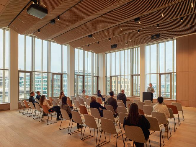 La grande salle du centre John W. Boyer,de l’université de Chicago,à Paris,dans le 13ᵉ arrondissement. FABRICE FOUILLET L’Américaine Jeanne Gang est fière des brise-soleil en pierre qui protègent le nouveau siège de l’antenne française de l’université de Chicago,à Paris.Clin d’œil au vieux Paris et à celui d’Haussmann,ce rideau de colonnes blanchâtres occulte le bois de la façade. Reflétant la structure,elle aussi en bois,du bâtiment,ce dernier était un élément fort du projet. C’est un des paradoxes de ce matériau : érigé en symbole de vertu environnementale,il est considéré sur le plan esthétique avec condescendance.
