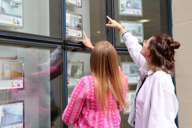 Des étudiantes regardent des annonces immobilières à Lille,le 2 août 2024. STEPHANE MORTAGNE / PHOTOPQR/VOIX DU NORD/MAXPPP Etudiante en droit à Lille,Eva (les prénoms ont été changés) a passé presque une demi-année à « vadrouiller » à droite et à gauche faute de trouver à se loger. Jusqu’à ce qu’un ami lui passe le relais dans ce 30 m2,une passoire thermique classée F. La jeune femme montre les murs creux où les souris pullulent,le radiateur cassé et ceux qui consomment trop,la moisissure le long des fenêtres et de la douche.