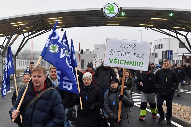 Des employés de Skoda manifestent contre les mesures du gouvernement tchèque visant à réduire le pouvoir d’achat,à Mlada Boleslav,en République tchèque,le 27 novembre 2023. SLAVEK RUTA/ZUMA-REA C’est bientôt le bout du chemin pour les trois amies. Après respectivement dix,quinze et vingt-six ans de travail dans cette usine qui fabrique des sièges de voiture,leurs gestes à la sortie du bâtiment sont familiers : rapide pause cigarette devant la cahute du gardien,la voix qui baisse quand la cheffe se plante derrière elles,partage de la voiture pour rentrer chez elles…