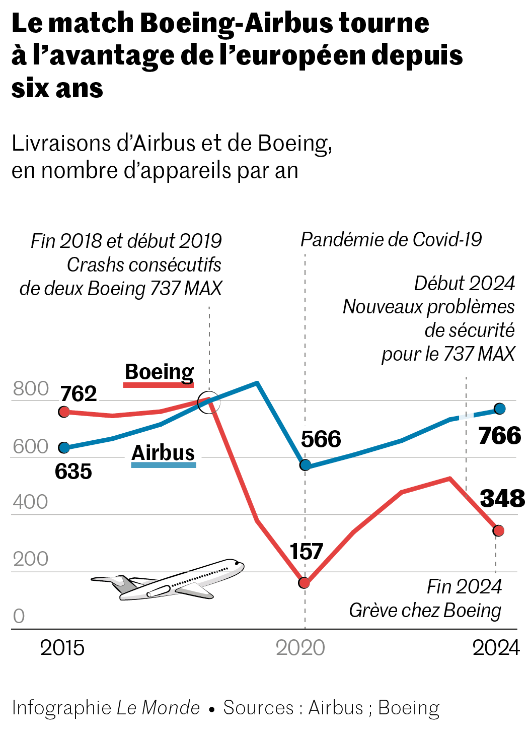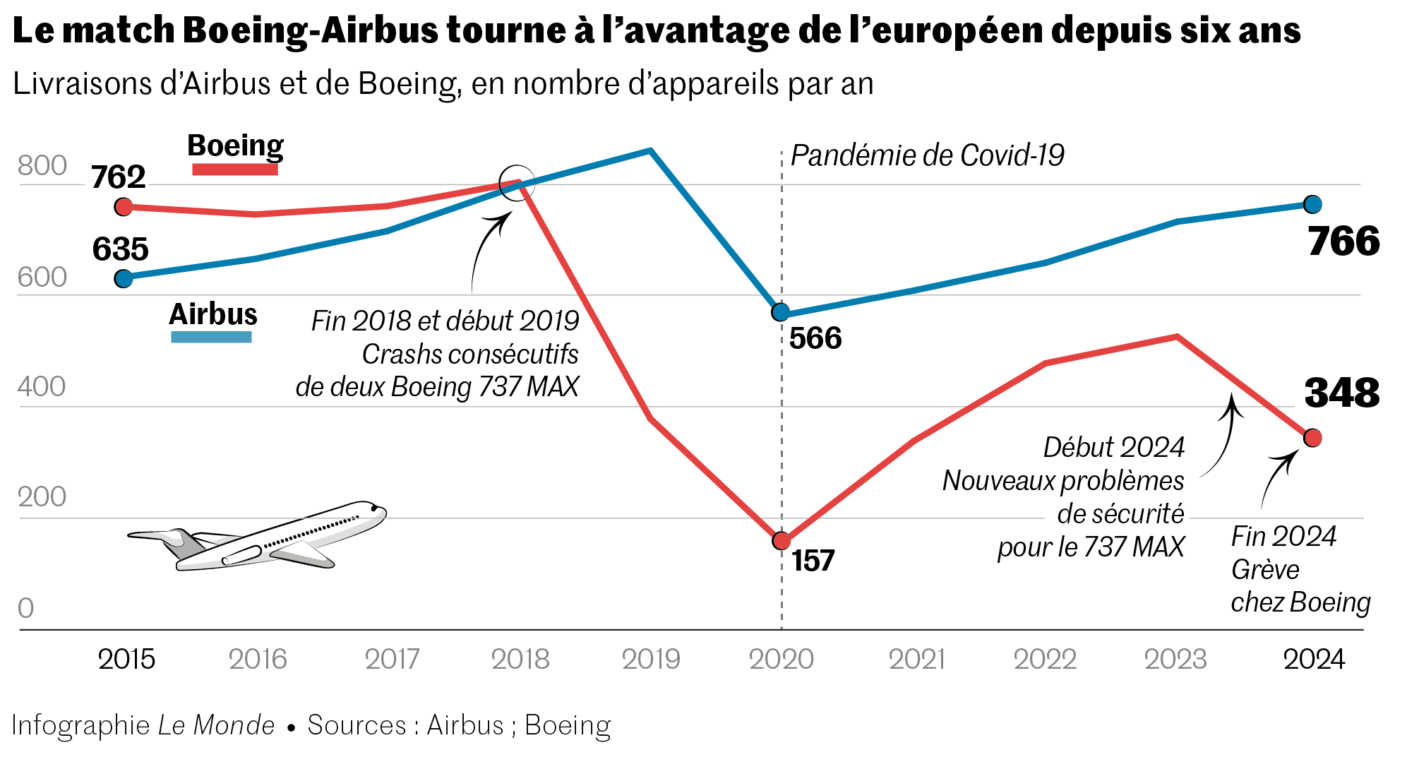 « Nous avons enregistré de solides prises de commandes dans toutes les activités en 2024,confirmant la forte demande pour nos produits et services »,s’est félicité Guillaume Faury,PDG d’Airbus,à l’occasion de la publication des résultats annuels de l’avionneur européen,jeudi 20 février. Le patron d’Airbus a de quoi être satisfait,l’an passé,sa division aviation commerciale a enregistré 826 commandes nettes d’appareils supplémentaires. Au total,le carnet de commandes d’Airbus était valorisé,fin 2024,à 629 milliards d’euros contre 554 milliards d’euros il y a un an. Avec cette performance,l’avionneur européen tutoie ses sommets et s’impose comme le numéro un incontesté de l’aviation civile.