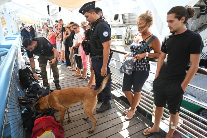 Une équipe cynophile fouille bagages et passagers à la sortie d’un ferry,dans la gare maritime de Papeete,le 20 février 2025. MIKE LEYRAL POUR « LE MONDE » « Environ 30 000 personnes »,sur les 280 000 habitants de la Polynésie française,ont déjà consommé des méthamphétamines,selon le président de cette collectivité ultramarine,Moetai Brotherson (Tavini,divers gauche). Il a annoncé un plan de lutte contre cette drogue,le même jour que les autorités de l’Etat. Qui ne veulent pas abandonner pour autant la lutte contre le cannabis.