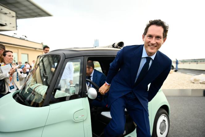 John Elkann,président de Stellantis,sort de la nouvelle Fiat Topolino,le 4 juillet 2023 à Turin,en Italie. STEFANO GUIDI / GETTY IMAGES En sortant du Grand Palais,où il assistait au Sommet pour l’action sur l’intelligence artificielle (IA) organisé par Emmanuel Macron,John Elkann engouffre sa haute silhouette dans une Peugeot 5008 bleu marine. « Très présidentielle,plaisante-t-il. Nous roulons à 91 km/h vers l’aéroport : elle tient très bien la route. Elle est hybride,le meilleur des deux mondes. » Direction : l’aéroport de Paris-Le Bourget,d’où il part pour la Chine.