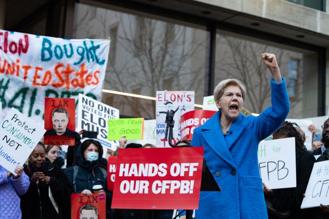 La sénatrice démocrate du Massachusetts,Elizabeth Warren,lors d’un rassemblement devant le siège du Consumer Financial Protection Bureau (CFPB),à Washington,le 10 février 2025. ZACH D ROBERTS / NURPHOTO VIA AFP Un mois après son arrivée au pouvoir,Donald Trump a entamé une attaque brutale contre la régulation financière aux Etats-Unis. Sa première salve a consisté à vider de sa substance l’agence de protection contre la fraude financière,le Consumer Financial Protection Bureau (CFPB),et à rendre plus difficile les discussions sur les sujets environnementaux et sociétaux entre les actionnaires et les entreprises.