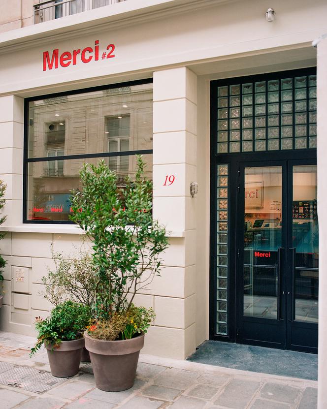 L’entrée du magasin et sa grande porte rehaussée de pavés de verre,côté rue de Richelieu,dans le 1ᵉʳ arrondissement de Paris. Seule une grande fenêtre fait office de vitrine. Les photos ont toutes été prises le 27 février. STÉPHANE RUCHAUD POUR M LE MAGAZINE DU MONDE Lundi 24 février,Paris,1er arrondissement. A cause du réaménagement du quartier,la rue de Richelieu est en travaux,barrée la journée,et cela depuis plus d’un mois. Voilà qui n’a pas facilité l’approche des camions de livraison. Contraints d’arriver dès potron-minet,ils ont pourtant déchargé en nombre leurs marchandises au numéro 19,adresse du nouveau magasin Merci,tout simplement baptisé Merci #2.