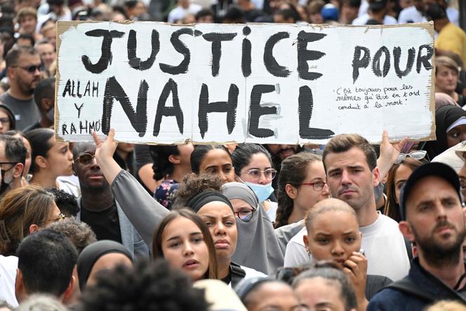 Lors d’une marche de commémoration pour l’adolescent abattu par un policier,dans le quartier Pablo-Picasso,à Nanterre,le 29 juin 2023. BERTRAND GUAY / AFP Le parquet de Nanterre a requis le renvoi du policier Florian M. devant la cour d’assises des Hauts-de-Seine afin qu’il y soit jugé pour « meurtre »,a-t-on appris mardi 4 mars. Le 27 juin 2023,à la suite d’un refus d’obtempérer et d’une course-poursuite dans les rues de Nanterre entre deux agents à moto et une voiture de sport occupée par trois mineurs,Florian M. avait mortellement atteint le conducteur,Nahel,17 ans,d’une balle dans le thorax,tirée à travers le pare-brise du véhicule au moment où celui-ci,un temps bloqué par la circulation,redémarrait. Filmés par une passante,les faits avaient déclenché plusieurs nuits d’émeutes dans le pays. Le second policier avait été placé sous le statut de témoin assisté du chef de « complicité de meurtre » ; le parquet a requis un non-lieu en sa faveur.