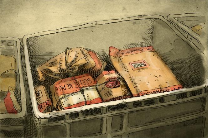 Les scellés contenant les carnets de Joël Le Scouarnec,devant la cour criminelle du Morbihan,à Vannes,le 25 février 2025. SERGIO AQUINDO POUR « LE MONDE » Le document devait ressembler à un faire-part,une feuille cerclée de filets noirs sur laquelle quelques mots auraient été tracés : « Détruisez tout sans rien lire ». Elle aurait été posée par-dessus trois ou quatre disques durs et une clé USB que les enfants auraient trouvés à la mort de leur père. Bien sûr,ils auraient obéi.