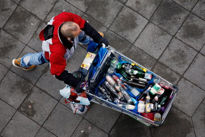 Un homme fait du porte-à-porte avec un chariot rempli de bouteilles en verre qu’il récupère pour la consigne,à Berlin,le 17 janvier 2019. DAVID GANNON / AFP L’historien Nicolas Marty,professeur d’histoire économique contemporaine à l’université de Perpignan Via Domitia,revient sur l’émergence et le déclin de la consigne dans les années 1950.