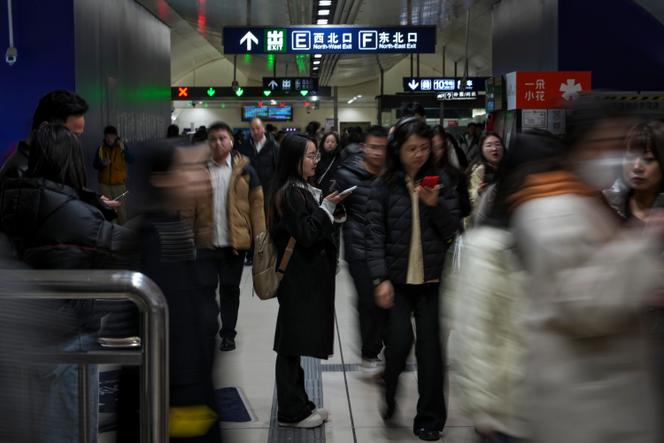 Dans le métro à Pékin,le 6 mars 2025. ANDY WONG/AP Depuis le 20 janvier,des panonceaux nouveaux trônent à l’entrée du Verger des pommiers