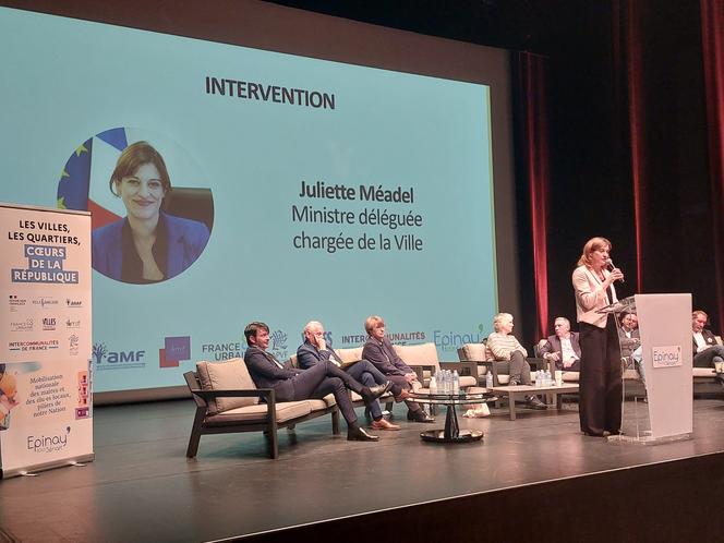 Sept associations d’élus ont lancé devant la ministre déléguée chargée de la ville,Juliette Méadel (au pupitre),une mobilisation pour les quartiers prioritaires,à Epinay-sous-Sénart (Essonne),le 13 mars 2025. CÉCILE CHEVALLIER/LE PARISIEN/MAXPPP Jeudi 13 mars,sept associations d’élus (Ville & Banlieue de France,Association des maires de France,Association des maires d’Ile-de-France,France urbaine,Villes de France,Association des petites villes de France,Intercommunalités de France) se sont mobilisées,en Essonne,pour lancer l’« appel d’Epinay-sous-Sénart ».