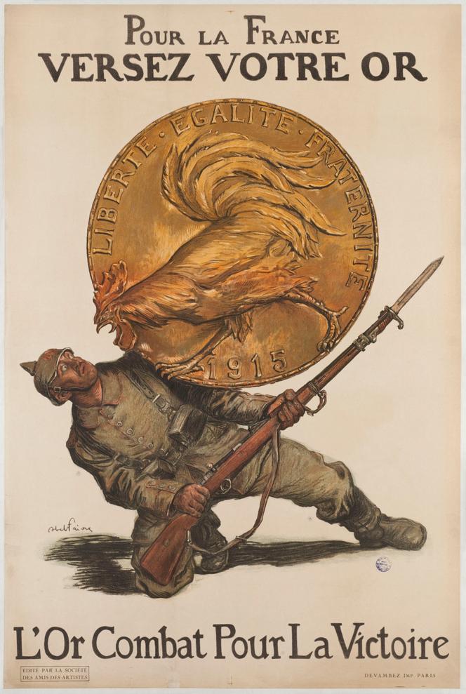 « Pour la France,Versez votre or » (1915),lithographie d’Abel Faivre. PARIS MUSÉES/MUSÉE CARNAVALET Mercredi 24 novembre 1915. Au lycée de jeunes filles d’Angoulême,la directrice,Marie-Cécilia Lafleur,passe dans toutes les classes pour une petite causerie. Son sujet ? L’emprunt de la « Victoire » lancé par le gouvernement. A chaque fois,elle explique la nécessité d’aider l’Etat à financer la guerre,les « conditions avantageuses » du taux de 5 % proposé,« le devoir financier de tous »,« en particulier de chaque petite fille fortunée »,comme le sont en général les élèves de l’établissement. Elle insiste : « Il ne faut pas conserver une pièce d’or ! »,tout doit être investi dans l’emprunt. Pour marteler le message,le vendredi,le texte de la dictée est extrait du dernier discours du ministre Alexandre Ribot,le septuagénaire revenu aux finances en 1914 : « Que se lève cette armée de l’épargne française ; comme celle qui se bat,elle est l’armée de la France,ou plutôt,elle est la France elle-même. Souscrivez ! »