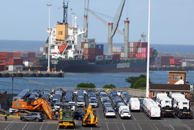 Des voitures fabriquées dans des usines sud-africaines destinées à l’exportation,avant leur chargement sur des navires,dans le port d’East London (province du Cap-Oriental),en Afrique du Sud. SIPHIWE SIBEKO / REUTERS L’Afrique du Sud,sous le feu des critiques de la nouvelle administration américaine,se doutait bien qu’elle ne serait pas épargnée lors de l’annonce de nouveaux tarifs douaniers par Donald Trump,mercredi 2 avril. La sentence ne pouvait toutefois plus mal tomber. En se voyant imposer des droits de douane de 30 %,le pays,dont l’industrie est la première du continent africain,est l’un des plus durement touchés. Ce qui a affaibli encore un peu plus le rand,la monnaie locale,déjà en baisse face au dollar,alors que le gouvernement d’union nationale semble au bord de l’effondrement.
