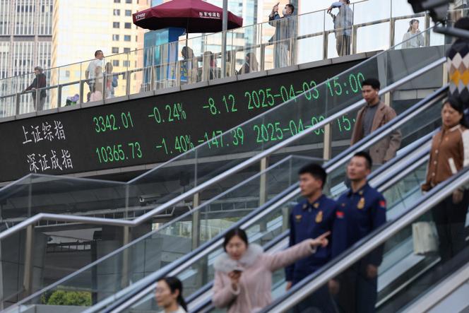 Les indices boursiers de Shanghaï et de Shenzhen,à Shanghaï (Chine),le 3 avril 2025. GO NAKAMURA / REUTERS Perdant-perdant. Vendredi 4 avril,en fin de journée,la Chine a dévoilé ses mesures de représailles aux droits de douane dégainés la veille par Donald Trump. Ce sera 34 % de taxe en sus des droits existants pour l’entrée de tous les produits américains sur son marché,comme les 34 % annoncés par le président américain sur les produits chinois,précipitant un peu plus les deux plus grandes économies de la planète dans la guerre commerciale.