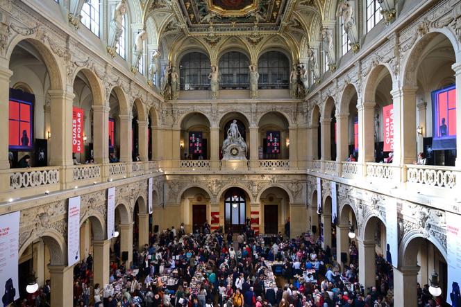 Des visiteurs dans le Palais de la Bourse pendant le festival Quais du Polar à Lyon,le 5 avril 2025. OLIVIER CHASSIGNOLE / AFP Un tonnerre d’applaudissements retentit dans le grand hall du Palais de la Bourse pendant le Festival Quais du Polar à Lyon : c’est le signal qu’un auteur venu dédicacer son dernier ouvrage les a tous vendus. Samedi 5 avril après-midi,cette ovation a résonné au moins trois fois. Une aubaine pour les douze librairies indépendantes : elles ont réalisé 400 000 euros de chiffre d’affaires en trois jours. Le 21e festival Quais du Polar,qui s’est achevé le lendemain soir,a accueilli plus de 125 écrivains de 17 nationalités,sur le thème « Au-delà des frontières ». Cette année encore,100 000 festivaliers ont assisté gratuitement aux conférences. Des mordus de polars.