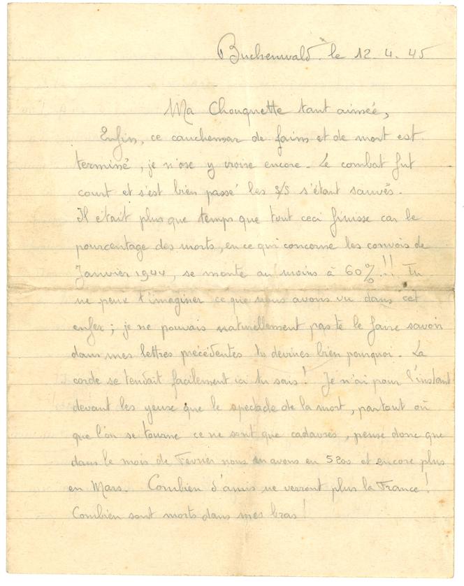 Enfin,ce cauchemar de faim et de mort est terminé. Je n’ose y croire encore. Le combat fut court et s’est bien passé,les SS s’étant sauvés. Il était plus que temps que tout ceci finisse car le pourcentage des morts,en ce qui concerne les convois de janvier 1944,se monte au moins à 60 % ! ! Tu ne peux t’imaginer ce que nous avons vu dans cet enfer ; je ne pouvais naturellement pas le faire savoir dans mes lettres précédentes,tu devines bien pourquoi. La corde se tendait facilement ici tu sais ! Je n’ai pour l’instant devant les yeux que le spectacle de la mort,partout où que l’on se tourne ce ne sont que cadavres,pense donc que dans le mois de février nous en avons eu 5 200 et encore plus en mars. Combien d’amis ne verront plus la France ! Combien sont morts dans mes bras !