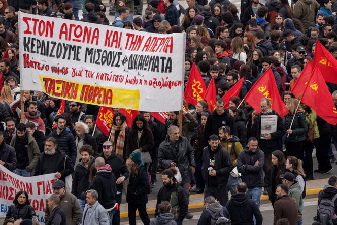Manifestation contre les bas salaires,à Athènes,en Grèce,le 9 avril 2025. Sur la banderole,on peut lire : « Dans la lutte et la grève,nous obtenons salaires et droits ». ALKIS KONSTANTINIDIS / REUTERS « Une vie digne » et un meilleur pouvoir d’achat. C’est ce que sont venus réclamer,pour l’essentiel,les 15 000 manifestants qui ont défilé à Athènes et Thessalonique,selon les chiffres de la police,à l’appel des principaux syndicats du public et du privé,mercredi 9 avril. Pendant vingt-quatre heures,la grève nationale a fait tourner au ralenti transports,entreprises,écoles,hôpitaux et administrations du pays.