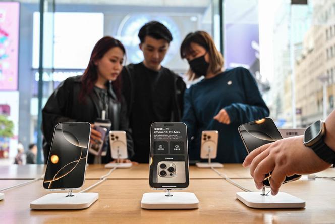 Des clients regardent des iPhone 16 dans un Apple Store,à Shanghai (Chine),le 11 avril 2025. HECTOR RETAMAL / AFP « Conçu en Californie,assemblé en Chine » : le slogan imprimé sur les iPhone résume à lui seul le modèle économique qui a fait la fortune d’Apple depuis deux décennies. Mais les droits de douane prétendument réciproques que veut infliger Donald Trump tuent ce modèle,au point que le locataire de la Maison Blanche a fait machine arrière,vendredi 11 avril au soir.