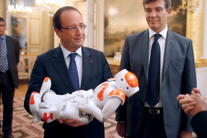Le président de la République,François Hollande (à gauche),et Arnaud Montebourg,alors ministre du redressement productif,à l’exposition sur le design industriel et la technologie française à l’Elysée,à Paris,le 12 septembre 2013. Dans les bras du président,un robot Nao,de la société Aldebaran. CHARLES PLATIAU/AFP C’est l’un des symboles de la réussite de la « start-up nation » française. Pourtant Aldebaran,dont on voyait les robots Nao et Pepper arpenter les plus grands salons mondiaux de la tech,n’est pas loin du précipice. Plus proches d’un Wall-E que d’un humanoïde à l’image d’un Robocop,ces robots,capables d’interagir avec des humains,de les guider dans un lieu donné,ont pourtant séduit un vaste public.
