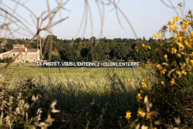 Au mas des Mourgues du Grès à Beaucaire (Gard),protestation contre la ligne à très haute tension prévue entre Jonquières-Saint-Vincent (Gard) et Fos-sur-Mer (Bouches-du-Rhône),le 5 juin 2024. FARINE VALÉRIE/MAXPPP « Enterrez la ligne,zéro pylône dans le Gard comme ailleurs ! » Sur les ronds-points,dans les champs,sur les panneaux d’affichage municipal… Dans le Gard comme dans l’ouest des Bouches-du-Rhône,la lutte menée depuis un an contre l’installation d’une ligne à très haute tension (THT) de 400 000 volts,qui doit s’étendre sur une soixantaine de kilomètres jusqu’à Fos-sur-Mer,persiste. Et elle a déjà obtenu une victoire : la mise en place d’un débat citoyen,version XXL.