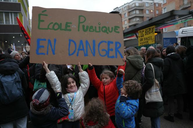 Lors d’une manifestation contre la fermeture de classes d’école primaire à Paris,le 11 février 2025. THOMAS SAMSON/AFP Dans les rues de Paris,la mobilisation contre les fermetures de classes dans les écoles continue de s’afficher sur de larges banderoles placardées sur les façades de dizaines d’établissements scolaires. La capitale perdra 110 postes de professeur des écoles à la rentrée 2025,ainsi que 92 postes d’enseignant en collège et lycée. Une répartition des moyens qui fait de la plus petite académie du pays le territoire le plus touché par les suppressions d’emplois.