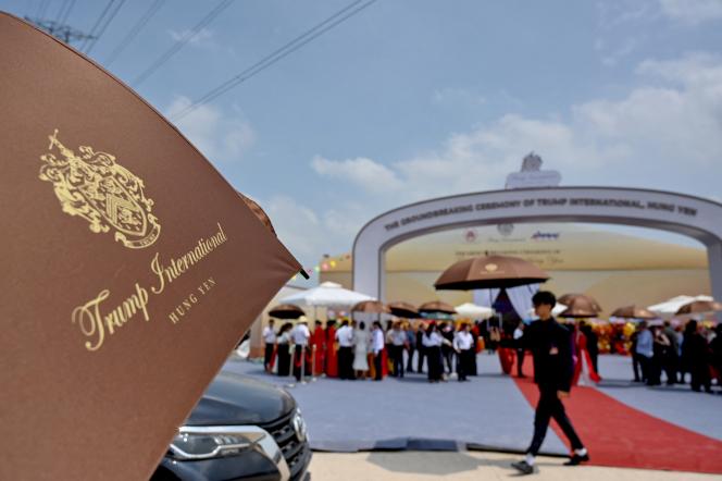 Cérémonie de pose de la première pierre du futur complexe de golf Trump International de Hung Yen,non loin de Hanoï (Vietnam),le 21 mai 2025. NHAC NGUYEN / AFP Le Vietnam,responsable du troisième plus grand déficit commercial avec les Etats-Unis,derrière le Mexique et la Chine,pour une valeur de 123 milliards de dollars (109 milliards d’euros) en 2024,est soupçonné par le gouvernement américain de servir de plate-forme de réexportation de la Chine vers les Etats-Unis,et cherche la parade. L’enjeu,pour ce pays communiste en plein essor que son nouveau dirigeant,To Lam,soumet depuis le début de l’année à un traitement de choc pour accroître productivité et croissance,est crucial. Les exportations américaines représentent 23 % de son produit intérieur brut (PIB). Après avoir annoncé 46 % de droits de douane à son encontre lors du « liberation day » de Donald Trump le 2 avril,le gouvernement américain les a réduits à 10 % pour trois mois comme pour les autres pays.